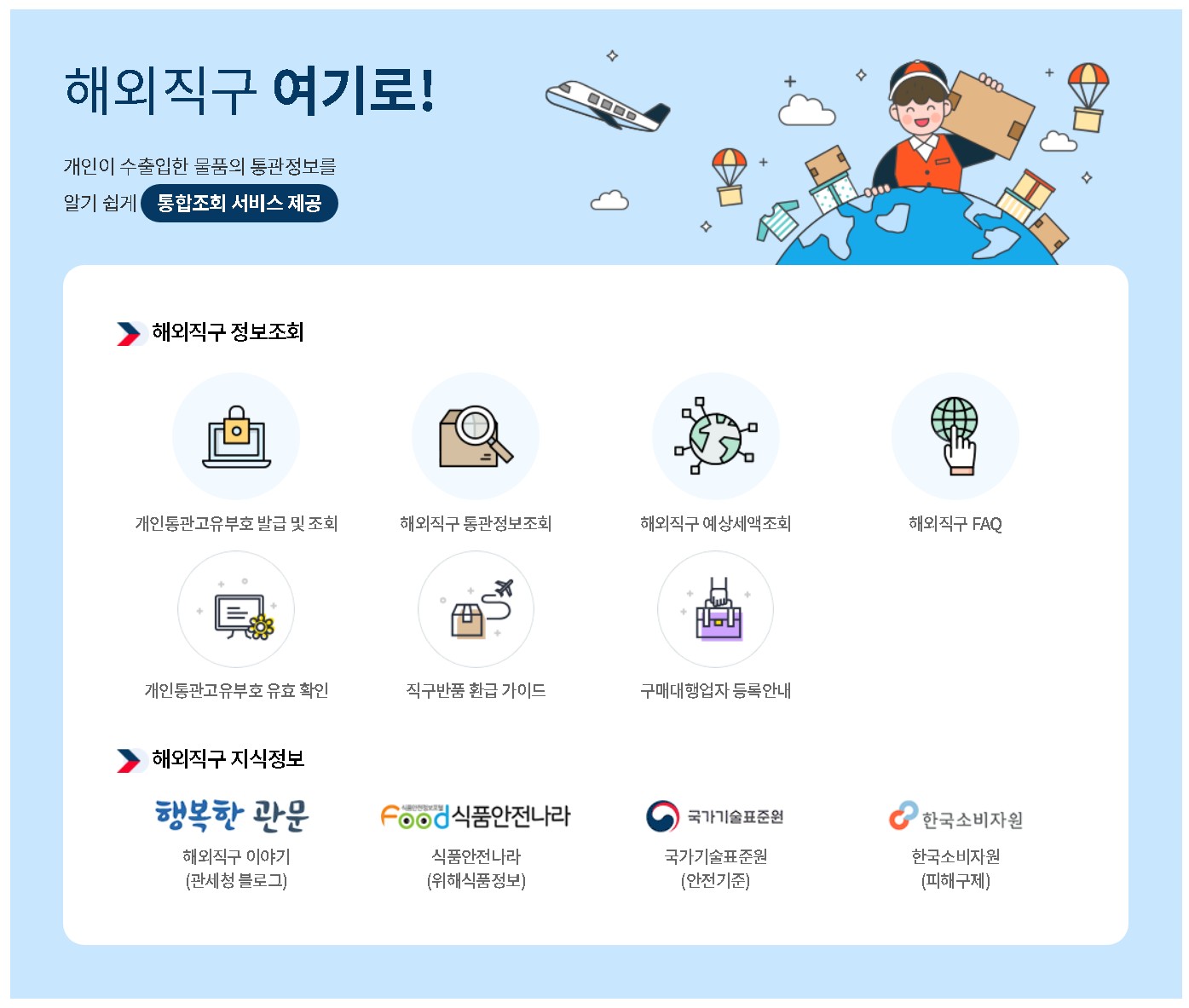 그밖에 개인통관부호의 발급정보, 직구 상품의 예상세액 및 직구에 관한 궁금증 정보 등을 조회할 수 있습니다.