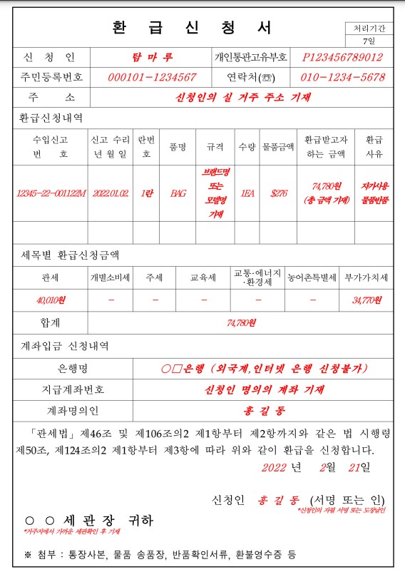 환급신청서 수입신고서는 제출하지 않아도 되지만 환급 신청할 때 아래 내용을 참고해 주세요.