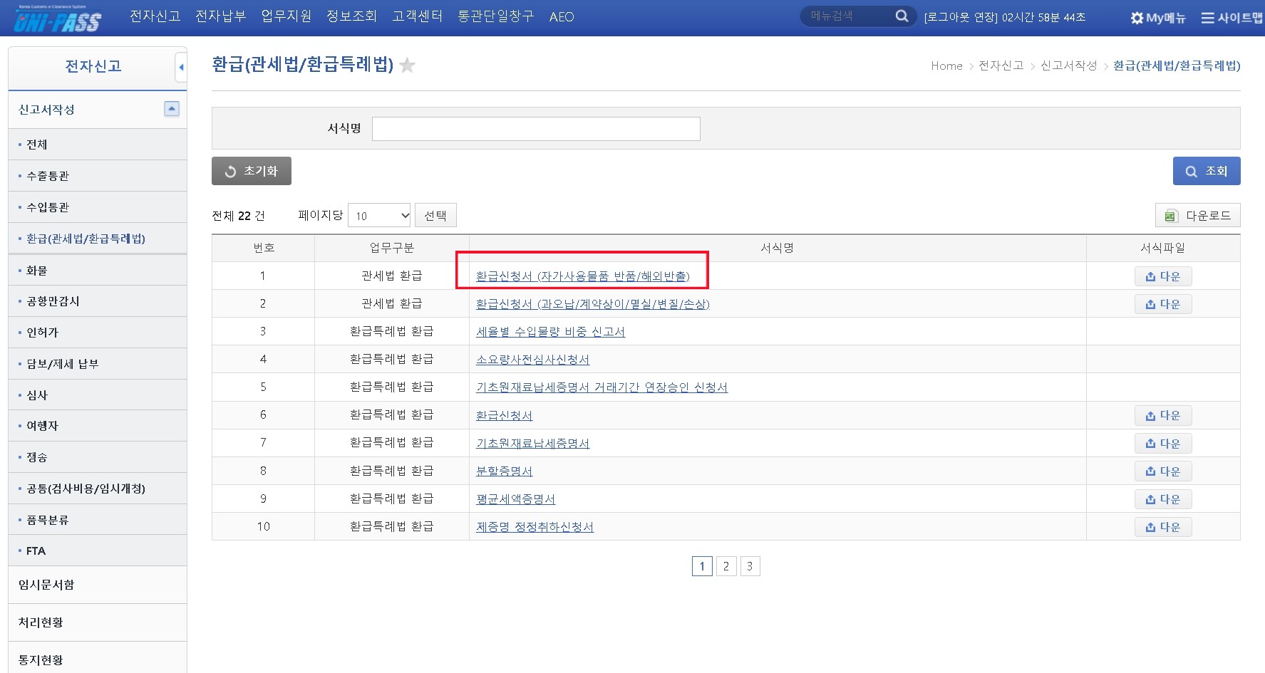 유니패스(unipass.customs.go.kr)에서 환급신청서 검색 서식자료실 클릭 서식명에 다시 환급신청서 검색