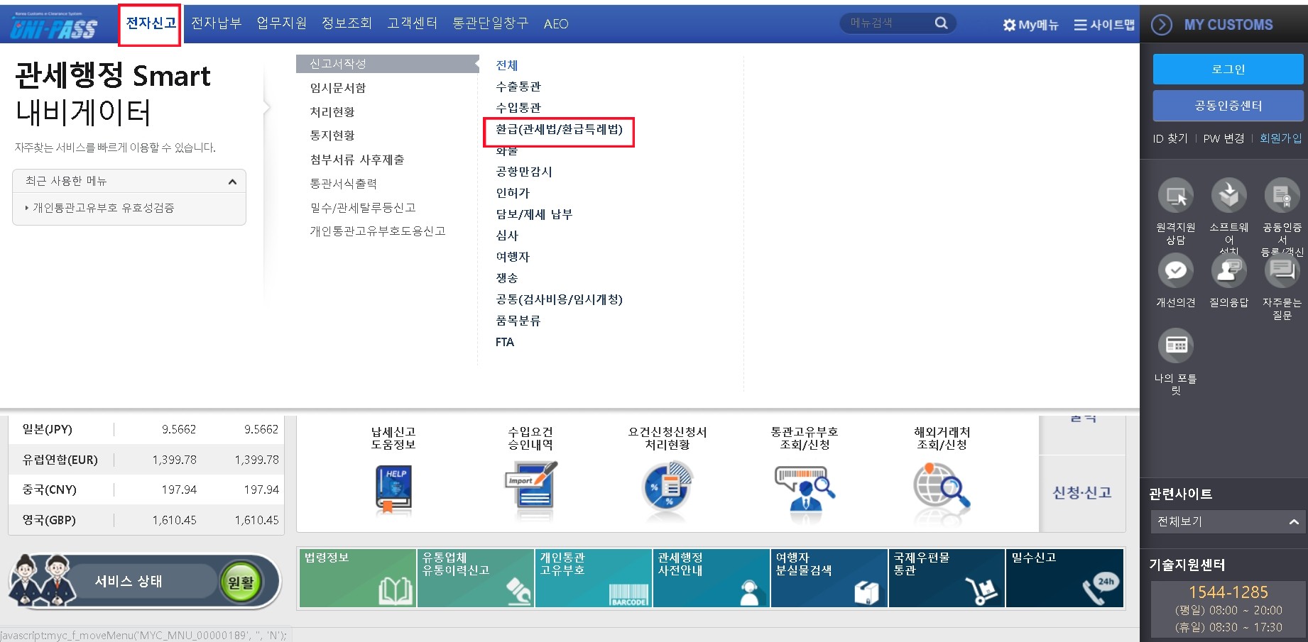 1. 전자신고 ㅡ> 3. 환급(관세법/환급 특례법)을 클릭해주세요.